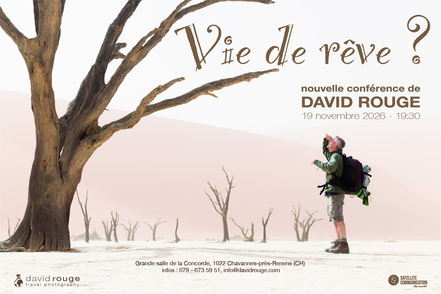 David Rouge partage son expérience de photographe aventurier à travers ses expéditions en solitaire, au coeur de la jungle, des déserts ou de l'Arctique.CONFéRENCES PUBLIqueS en suisse romande